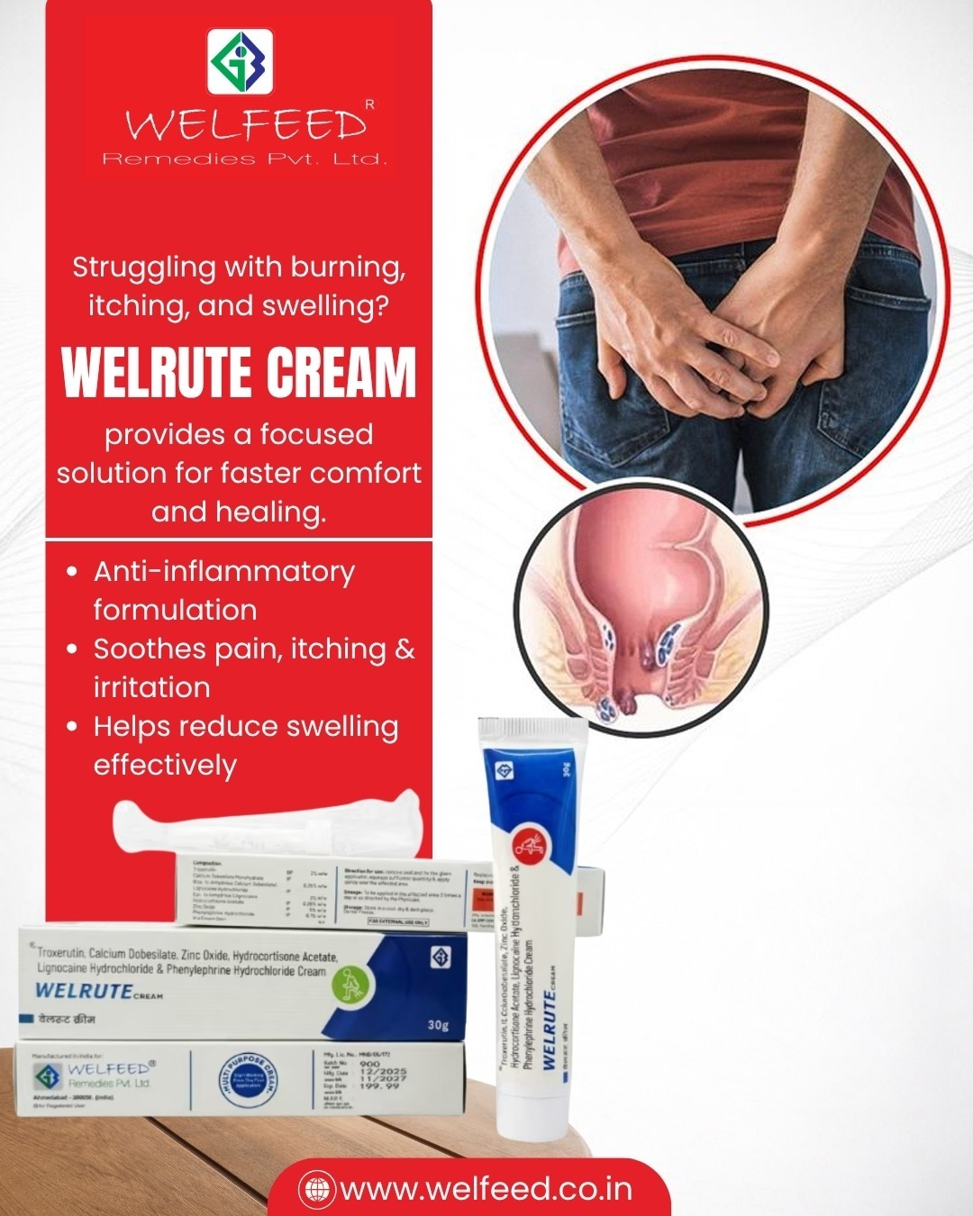 Welrute Cream is a specially formulated semi-solid topical preparation for external use that provides effective relief from discomfort associated with anal conditions. It is widely recommended for patients suffering from swelling, itching, pain, burning sensations, and irritation, helping restore comfort and improve daily quality of life. The formulation is clinically developed to offer soothing action while supporting fast symptom relief.